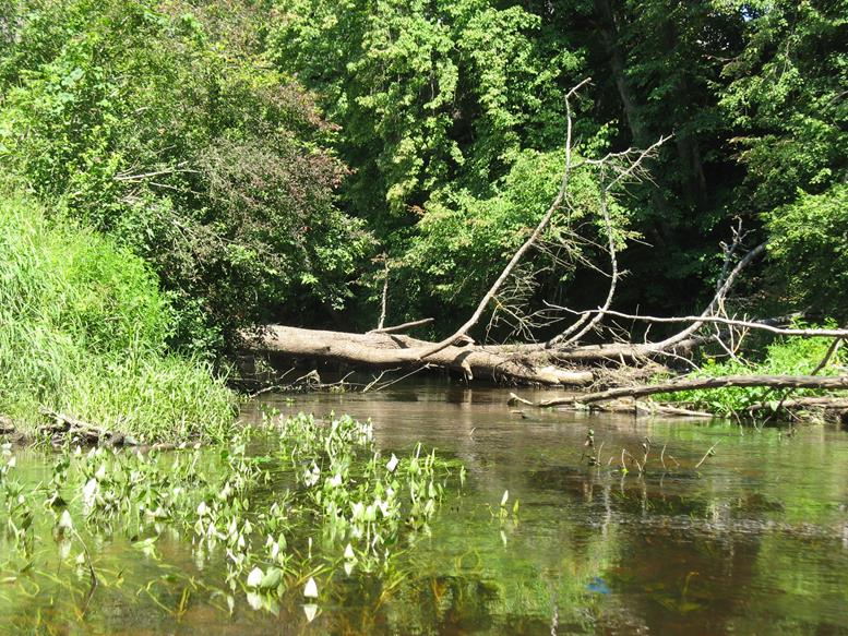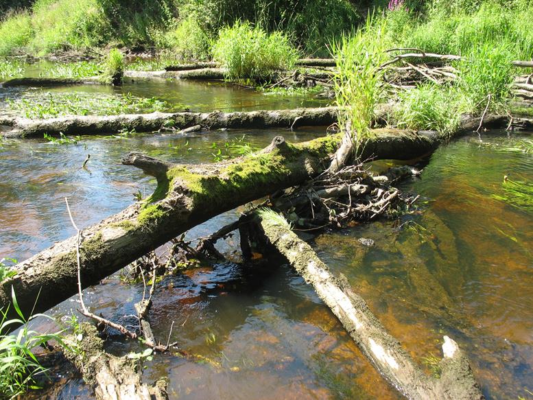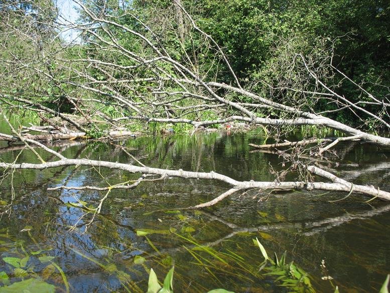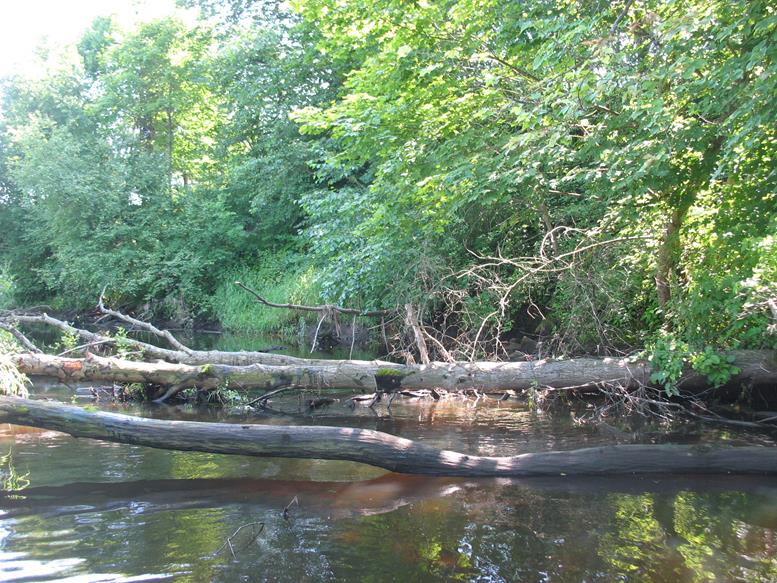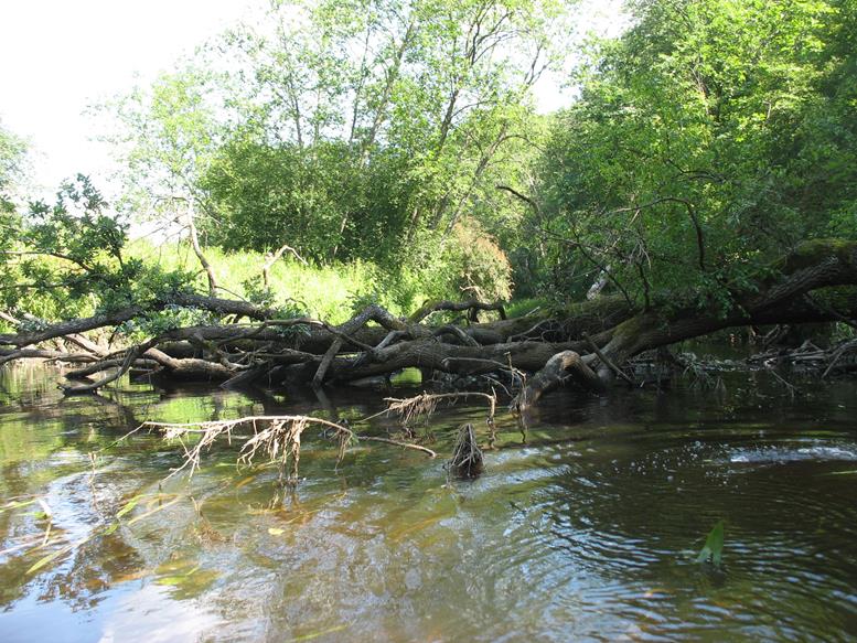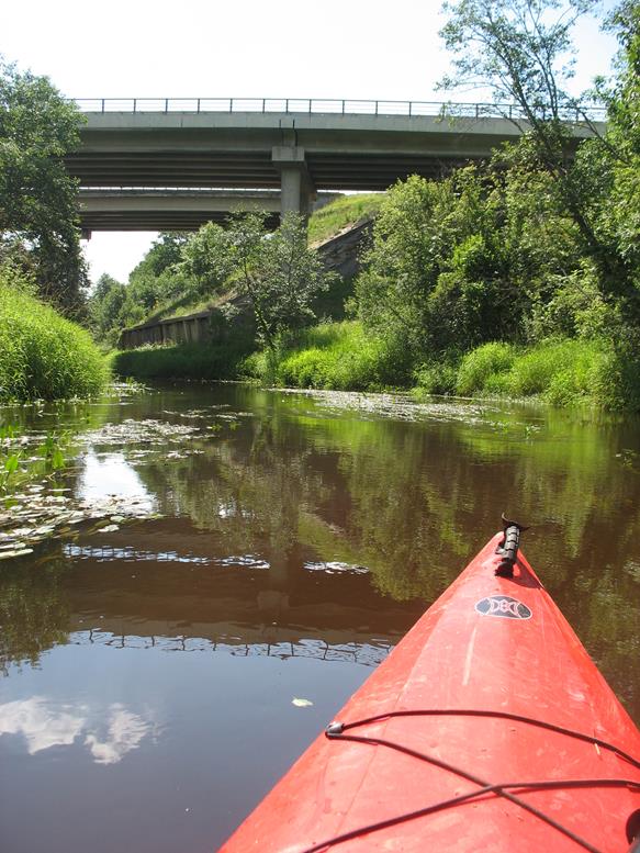 Plaukiant toliau nuvirtę medžiai tampa jau įprastu trasos atributu, todėl nustojam keiktis ir, susitaikę su likimu, perkėlinėjame baidares arba bandome, kur išiena, prakišti pro siaurus tarpus tarp vandens ir medžių. Smagiai nuteikia ir vienoje vietoje nuvirtę du ar trys medžiai, per kuriuos baidares perkėlinėji ar ieškai lengvesnio kliūčių įveikimo varianto. Nuvirtę medžiai nebestebina, bet džiugina, kad ne visi jie nuvirtę į vandenį, ir dalį jų galima įveikti praplaukiant su baidare pro apačią. Pakeliui dešinėje pusėje atsiveria nedidelis skardis. Upė šiek tiek laisvesnė nuo kliūčių. Tačiau tai trunka neilgai, nes priekyje vėl medžių nuovirtos ir vėl tenka lipti iš baidarių bei įveikinėti kliūtis. Prie nuvirtusių medžių upės srovė sunešusi daug mažesnių medžių kamienų, šakų, netgi iš „europadėklų“ ir plastmasinių butelių pagamintų savadarbių plaustų. Juos irgi panaudojame kliūčių įveikimui. Taip plaukdami ir įveikdami kliūtis, kurių skaičių jau seniai pametėme, artėjame prie tilto per autostradą Vilnius – Panevėžys.