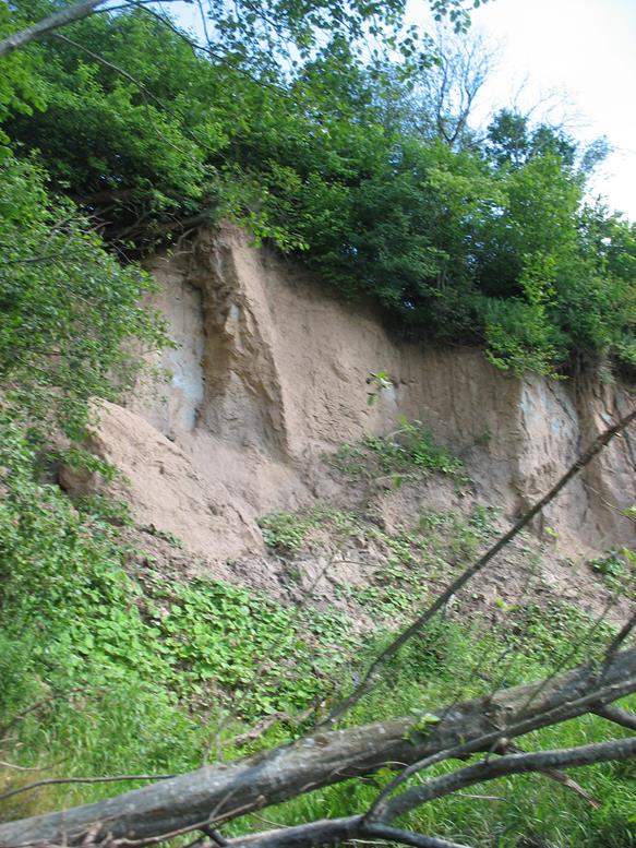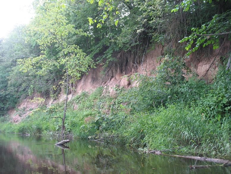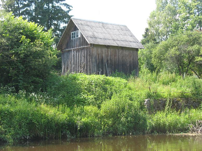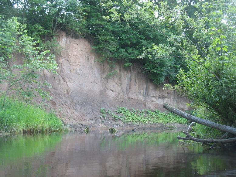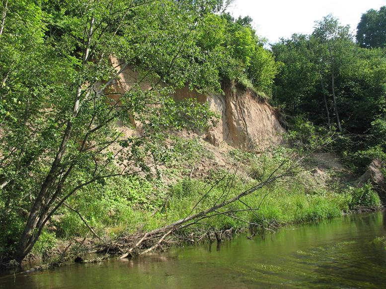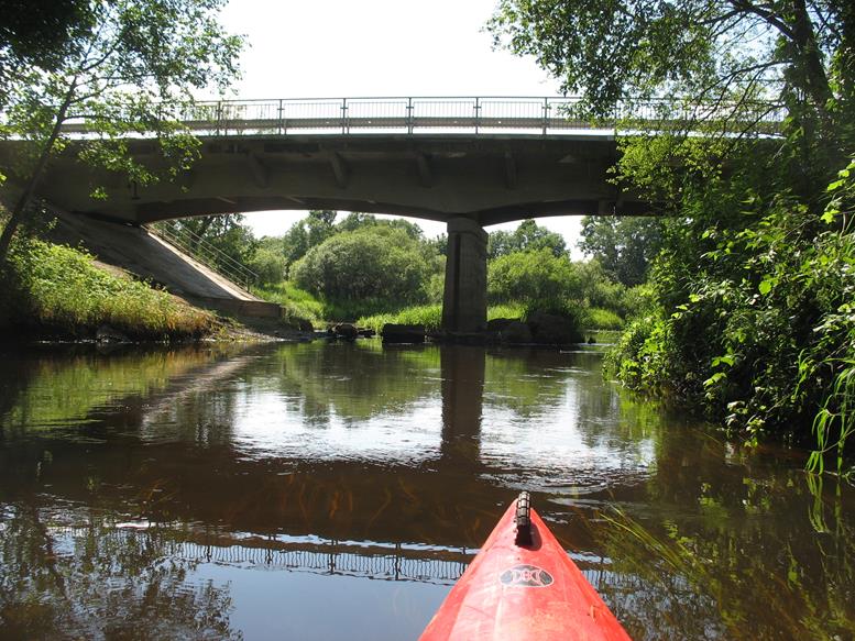 Praplaukiant dvigubą betonionį tiltą iš apačios gerai matosi vietomis pažeistos tilto konstrukcijos. Už tilto laukia dar keletas nuvirtusių medžių. Netoli dešinėje pusėje ant kalniuko sodyba su senu kluonu. Tiesiai prieš ją kitoje upės pusėje smėlėta pakrantė pati kviečia stabtelėti atokvėpiui. Toliau trasoje praplaukiame pro dar vieną tiltą. Tai vieta, kur paprastai paleidžiami baidarininkai plaukti lengvesniu maršrutu. Iki šios vietos plaukėme tris valandas. Nuo ten upė platesnė, medžių nuovirtų nebelieka – už tilto tik vienas nuvirtęs medis, visiškai užtveriantis kelią. Kiti medžiai plaukti netrukdo, todėl sėkmingai iriamės toliau. Kairėje pusėje atsiveria vaizdas į dar vieną skardį. Gamtovaizdis malonus akiai, nors išlipimui tinkamų vietų nėra daug.